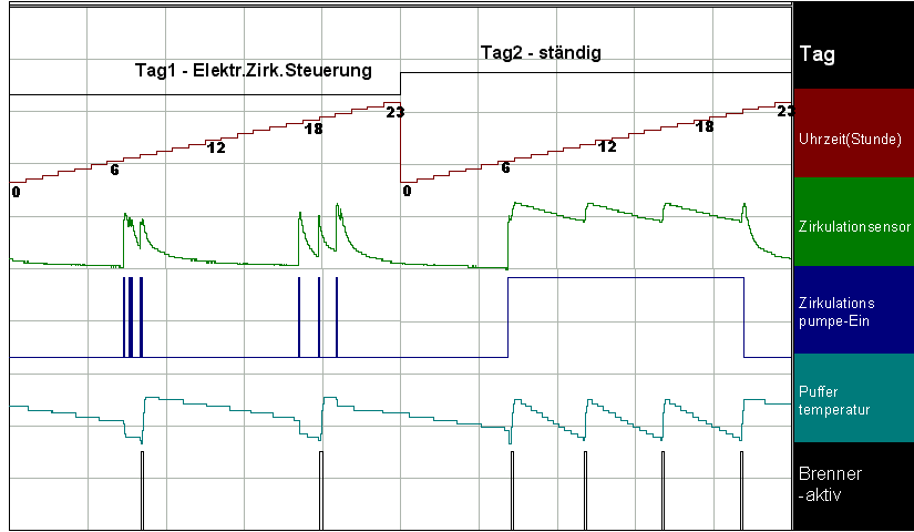 Puffer wieder aufzuheizen. Am 2.Tag als die Zirkulationspumpe ständig lief (6.30 bis 21:00) musste der